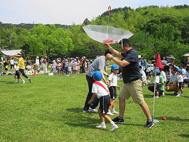 <年長・青組親子レクレーション 傘の玉入れリレー>
