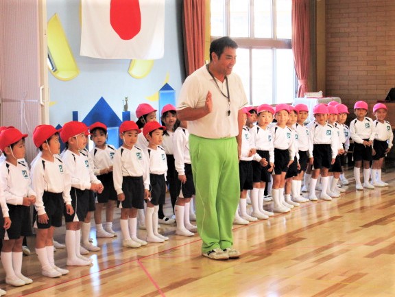 園内体操のご指導もして頂いている小林先生とごあいさつ!「おはようございます」