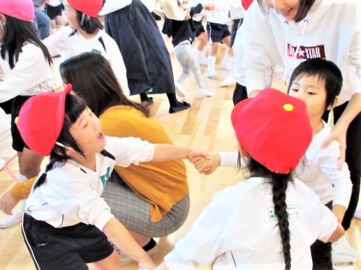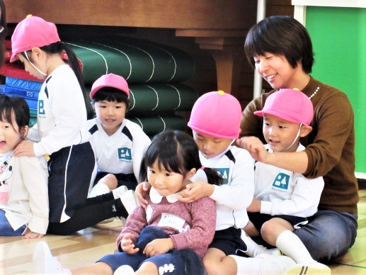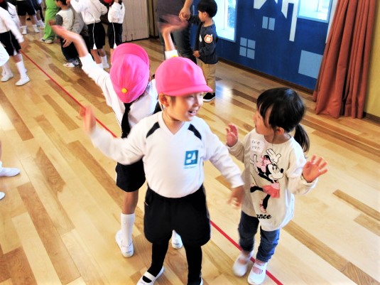 プレゼントのバックも喜んでいただき、又、お歌を歌っている赤組さんの真似っこをして、体を動かし出す