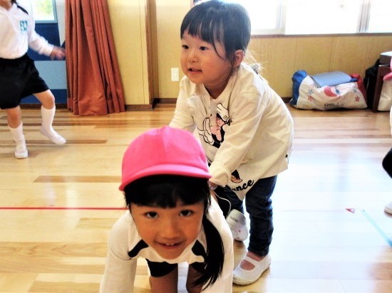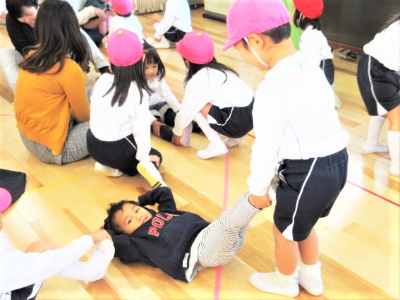 早速、赤組さんとグループを作り、おしりとおしりをくっつけて『バンザーイ!!』