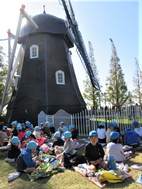 デンマーク風車の前で仲良く美味しくいただきまーす!
