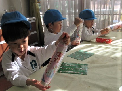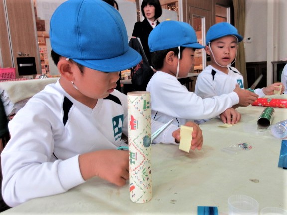 シールを剥がしたり、のりを付けた紙を筒に巻き付けたり、ハサミで、3等分に切ったり・・・と