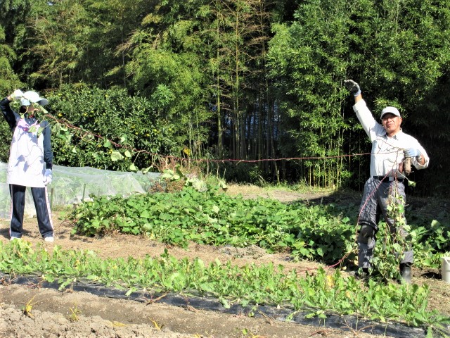 今日は、掘りやすいように、つるや葉を切って頂いています。