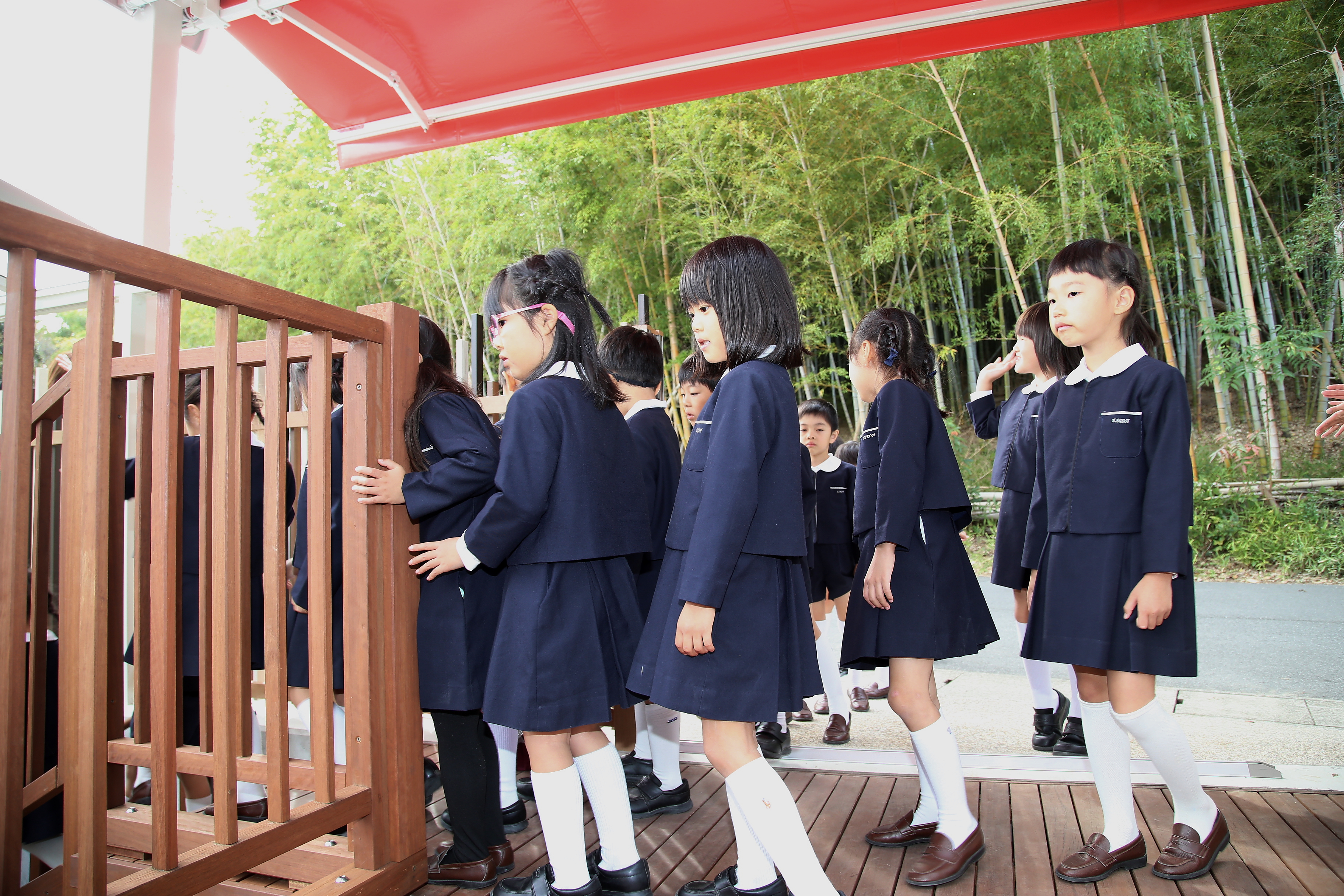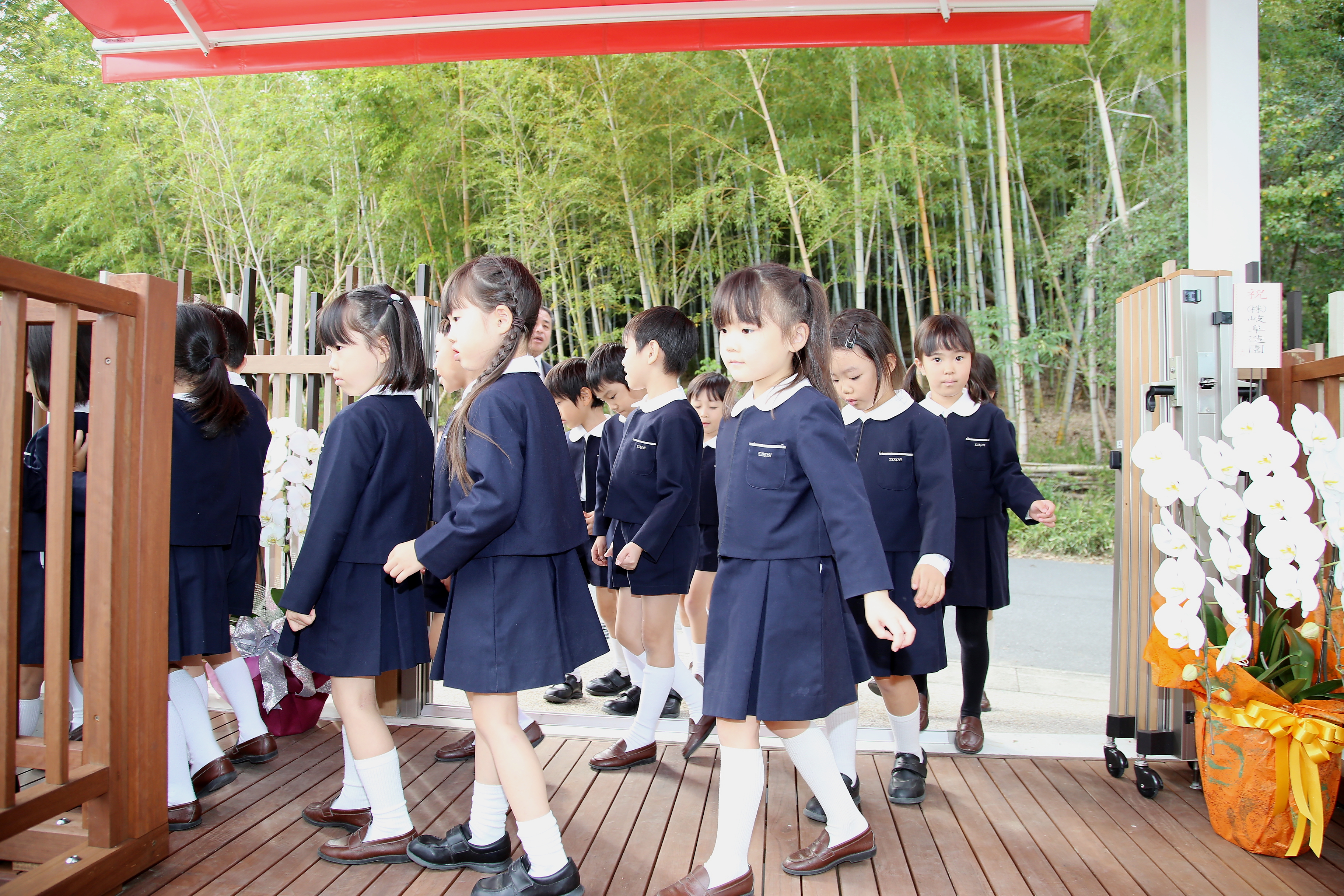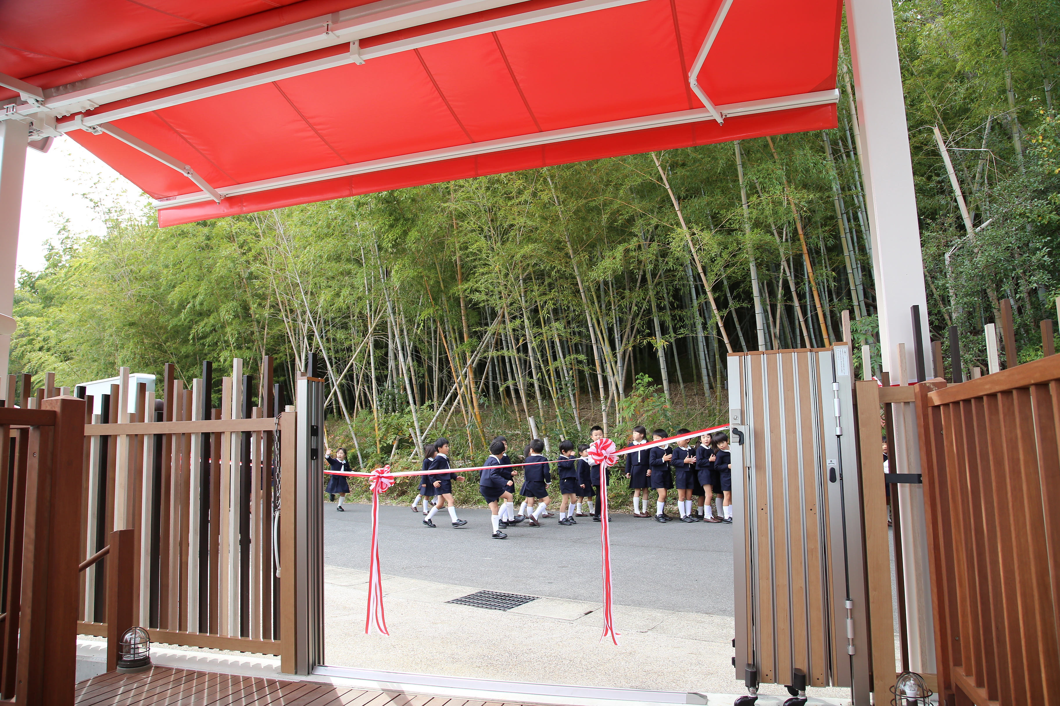 青組(年長)の子ども達が、新しい赤レンガ門を通ります。