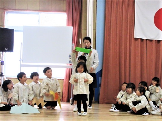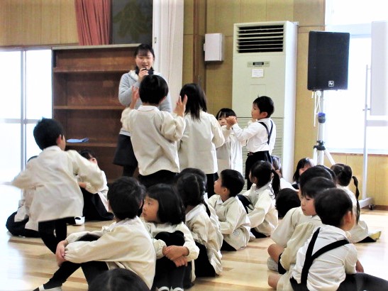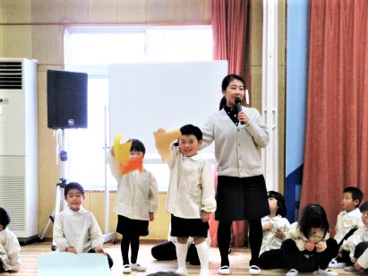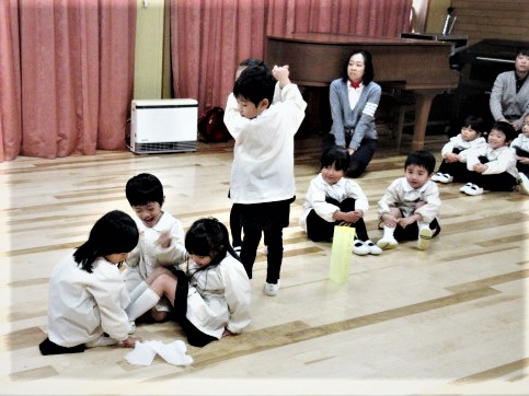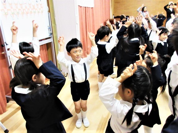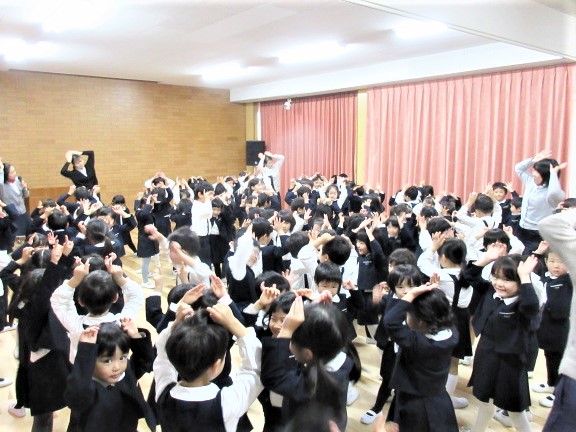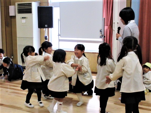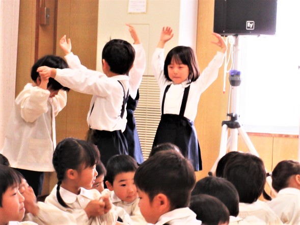 最初に、先生達が、ダンスの見本です!♪軽快な曲に合わせて、プレゼントを持ったサンタさんになったり、トナカイ、ツリーになって踊ります♪