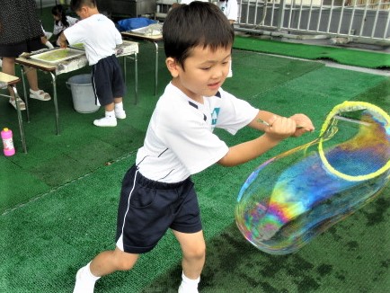 大きなシャボン玉ができると「わーーー!!」と歓声があがり、見ている子どもたちもワクワクしました!