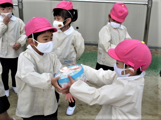 片手で運ぶのは少し難しいので、今度はプレゼントを重ねて両手で渡していきます。