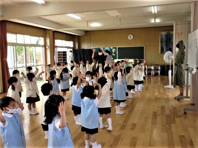 腕をたかーく、たかーく伸ばして、伸びて!伸びて!