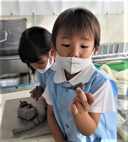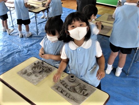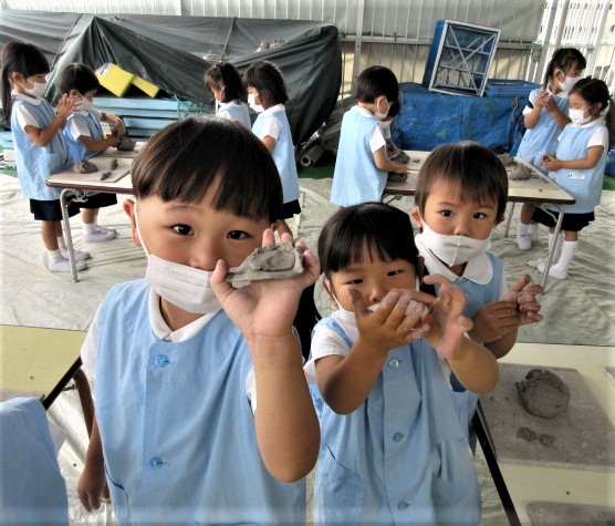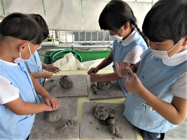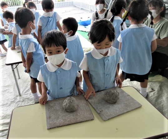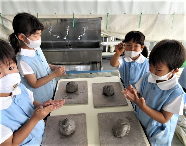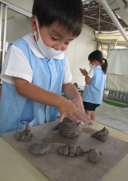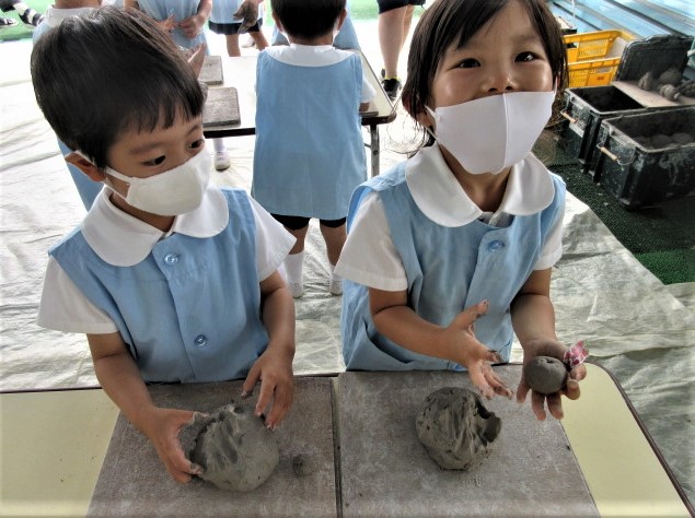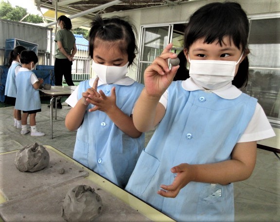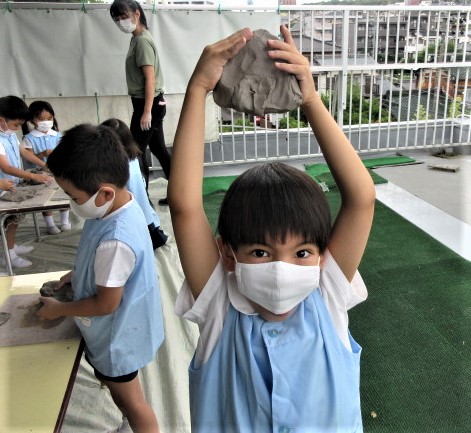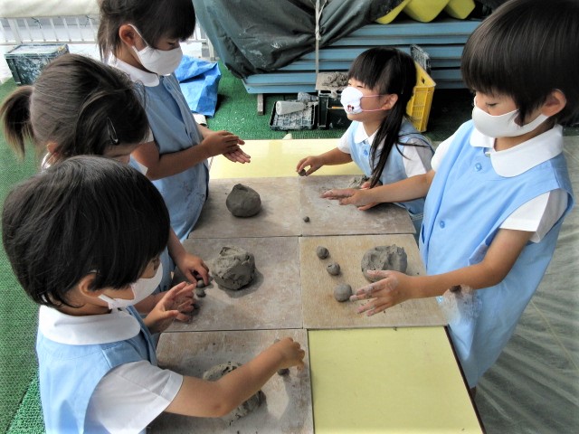 6月の金曜日は、毎週、縦割り(異年齢保育)で土粘土を行っています。
