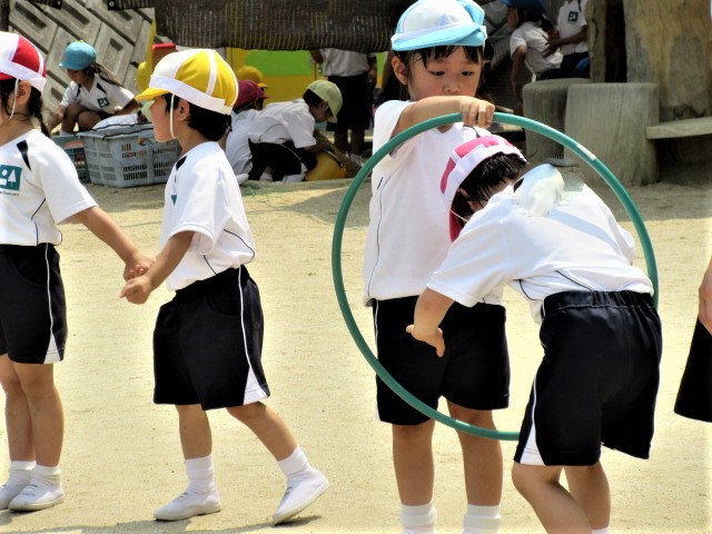 おとなりのお友達と手をつないで、手を離さないようにフラフープを送っていきます。