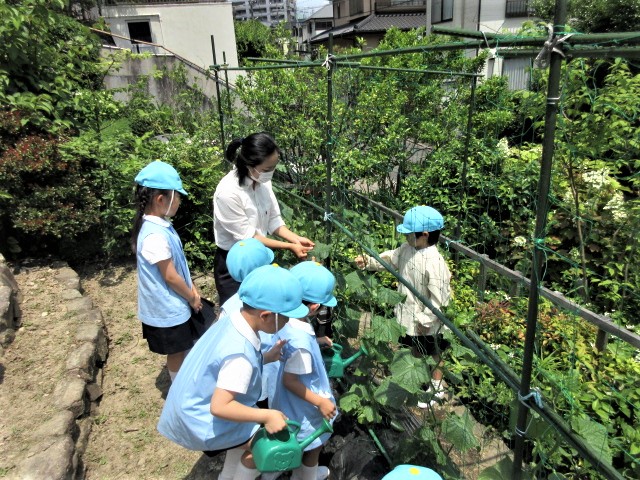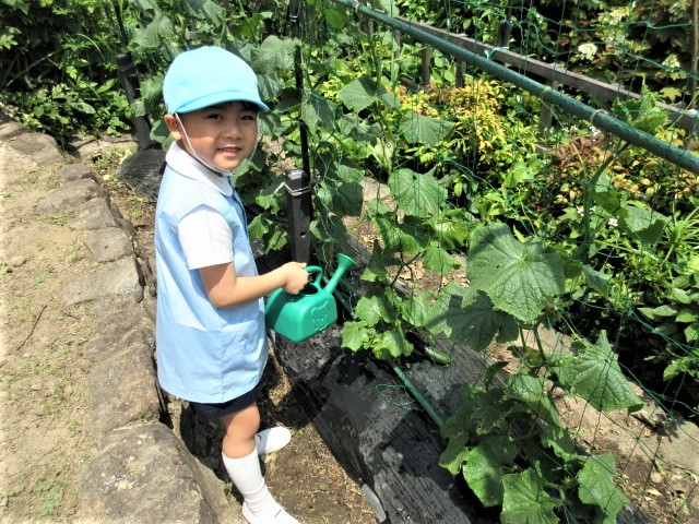 青組さんは、園内畑に水やり! 何が生ってるのかな・・