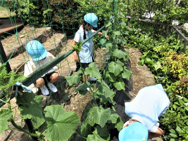 トゲトゲ葉っぱを触ったり、赤ちゃんキュウリを観察したり・・・。