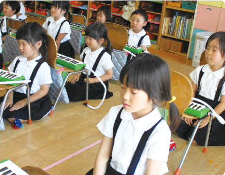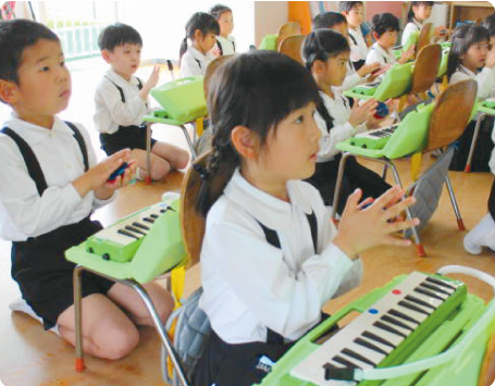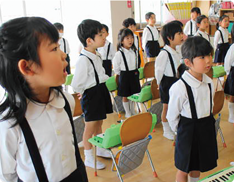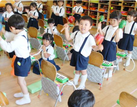 ミュージックダイアリーは、本学園独自の音感教育です。日本でもよく知られている世界の音楽・リズムを取り入れることにより、よりグローバルな視点で音やリズムを感じることができます。また、毎日続けることにより、自ずと音感は養われ、音やリズムを耳や体で感じ取る力、集中力を高めます。