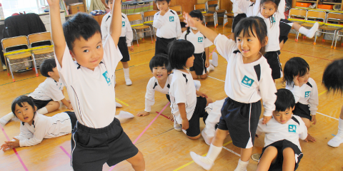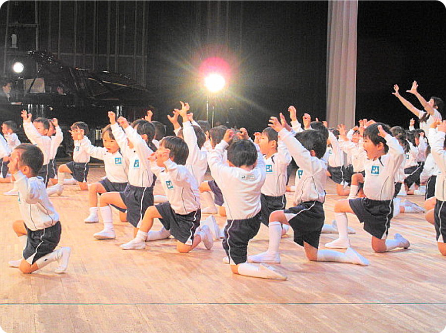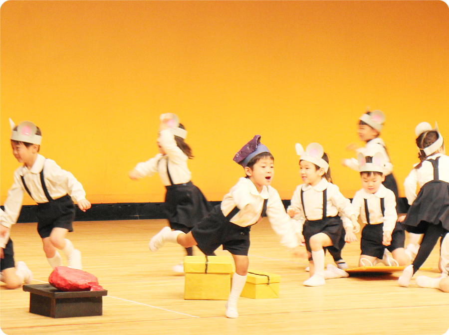 幼稚園の行事は仲間づくりをすすめますが、より深く人間関係を学び、絆や感動の体験を味わうために、しっかりとねらいを持った「発表会」が必要です。本学園では、この他に「音楽リズム」「運動会」「展覧会」「劇あそび発表会」という4大行事を発表することで、仲間づくりを深めています。