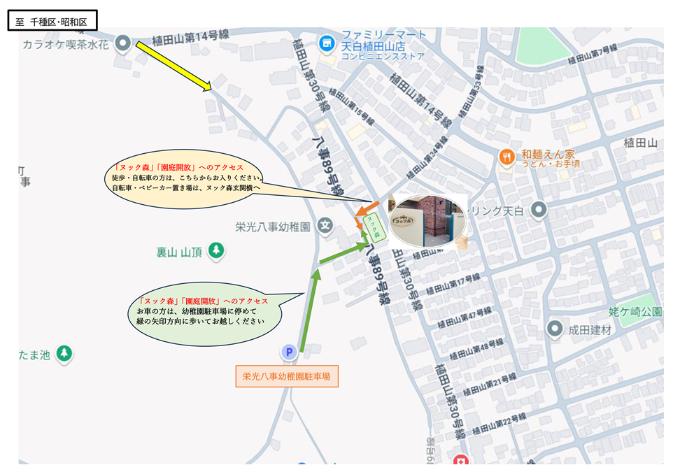 - オアシス門(幼稚園の東側)の門よりお入りください。